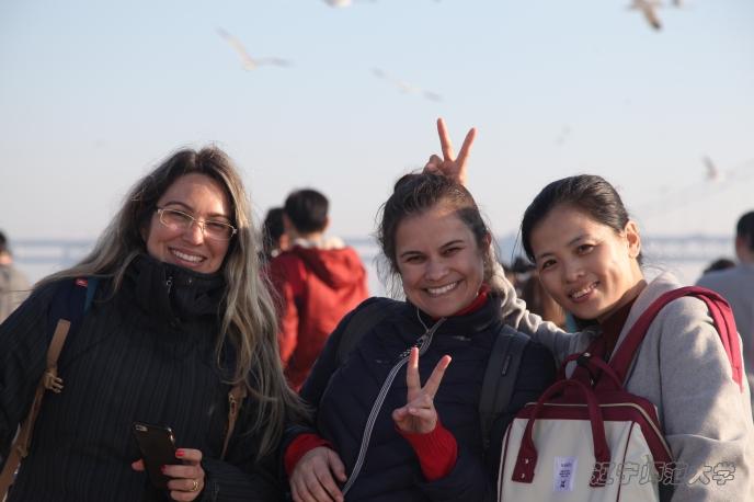 下午1点整,全体师生在文科楼前聚集一同登上观光巴士,一路上欢歌笑语,在导游的热情讲解下感受海滨城市大连的独特魅力。到达东港,停车活动四十分钟,大家走向海边,感受徐徐海风带来的盎然春意。随后师生又乘车沿滨海路行驶至星海广场,途经跨海大桥,开阔的海滩风光与风光旖旎的景色让留学生们惊叹不已。海天一色,碧波荡漾,伴着浪花拍岸,海鸥飞翔,参加活动的全体师生一同合影留念。